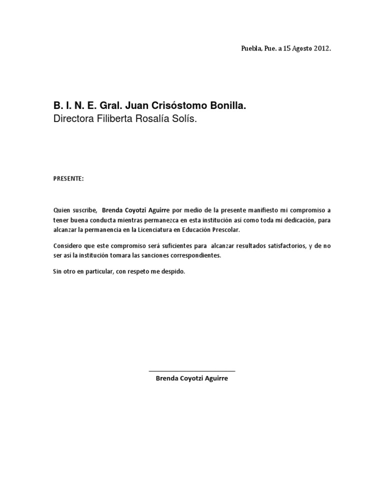 Estructura básica de una carta de compromiso laboral. Me comprometo a cumplir los procedimientos de trabajo establecidos por la empresa en la unidad minera chungar animn, quedando a merced de cualquier sancin. Para especificar bajo qué circunstancias se celebrará un contrato.