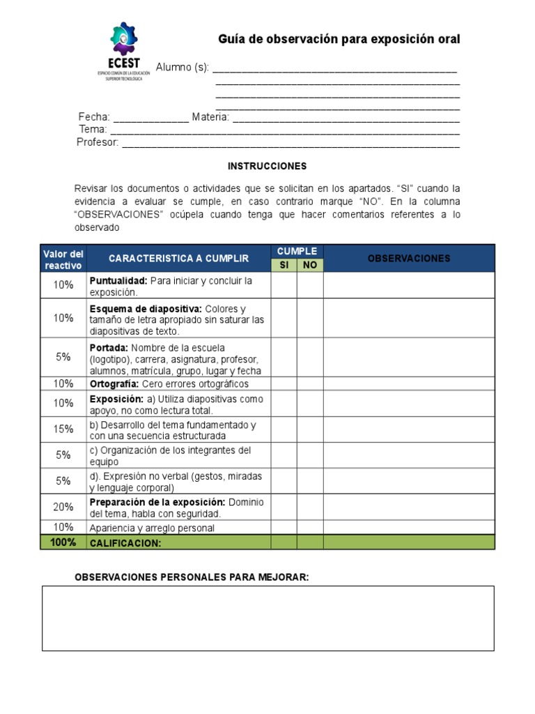 Actividad (es) que se desarrolla (n). Descarga la guía de observación y reflexión de la práctica docente en colectivo escolar, formato pdf para llenar. Go.01 (50%) desempeño a evaluar: