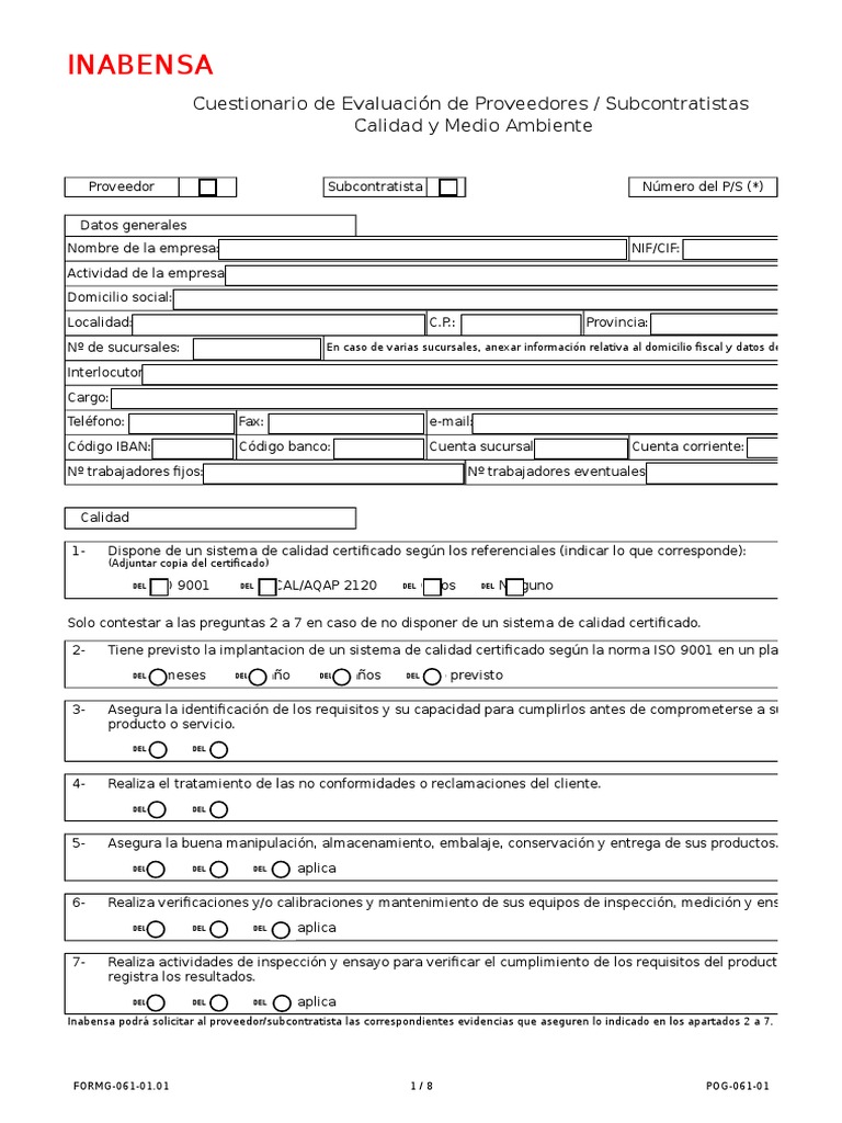 Cuestionario Evaluacion Proveedores Subcontratistas | Pdf | Calidad (Comercial) | Producción Y Fabricación